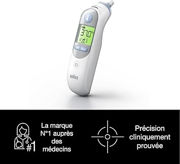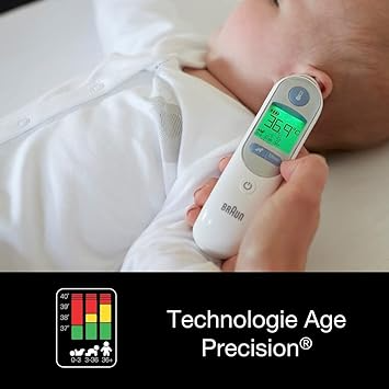 Benefit from the clinically proven accuracy of the #1 brand with doctors(1). The Braun ThermoScan 7 ear thermometer allows you to easily and quickly monitor the temperature. Our Age Precision technology correctly interprets measurement based on age (0-3 months, 3-36 months or 36+ months) to ensure you get the most accurate results so you can manage symptoms at home with confidence. The easy-to-use ExacTemp stability indicator uses both a light and audible signal to confirm the stable position of the device in the ear. The device has a preheated tip designed to approach body temperature to improve accuracy. It comes ready to use with 2 AA batteries, 21 Braun hygienic tips to keep the lens clean and clear, and a protective holder for safe storage. It is gentle enough for babies and safe and easy to use for the whole family. 1) Braun is the reference brand in terms of awareness, recommendation and home use by the physicians surveyed. Gfk, an online study conducted with n=800 MG and pediatricians in 4 European markets (n=200 per market, Germany, UK, France and the Netherlands), study carried out between Nov and Dec 2022. OR 2)Age-based fever thresholds gave significantly better estimates of illness than fixed fever -Kasbekar R, Naz A, Marcos L, et al. Threshold for defining fever varies with age, especially in children: A multi-site diagnosis accuracy study. Nursing Open 2021;8:2705-2721 (Study sponsored by Kaz USA, Inc.). Herzog L., Philips S. Addressing Concerns About Fever. Clinical Paediatrics. 2011: 50 (no.5): 383-390. 3) Loveys AA, Dutko-Fioravanti I, Eberly SW, Powell, KR. Comparison of ear to rectal temperature measurements in infants and toddlers Clinical Pediatrics, Volume: 38 Issue: 8, page(s): 463-466. 1999 4) Nimah MM, Bshesh K, Callahan JD, Jacobs BR. Infrared tympanic thermometry in comparison with other temperature measurement techniques in febrile children. Pediatric Care Med. 2006;7(1):48-55 (As eardrum shares the same blood supply with the brain’s temperature control center, the hypothalamus.) – Netter FH, Atlas of Human Anatomy. Novartis Medical Education, East Hanover, NJ, 1997, PP 63, 95.