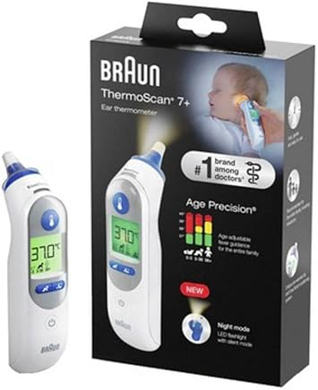 Braun ThermoScan 7+ Ear Thermometer – Fast, Soft and Easy to Use The definition of fever varies by age**. The Braun ThermoScan 7+ thermometer features patented Age Precision technology, an adjustable fever indicator that takes into account age to interpret measurements for you. The thermometer has a night mode with light, for use in the dark, but also a silent mode to avoid waking up. Most used and recommended brand by doctors* Age Precision Technology? Fever indicator by age colour coded display for easy to interpret results A wide angle probe for accurate measurements even on newborns Braun ThermoScan 7 with Age Precision is as accurate as rectal temperature measurement on newborns Night mode: light for use in the dark, but also a silent mode to avoid waking ups Pre-heated tip for reliable measurements ExacTemp technology to ensure stability of the device before taking Temperature A quick, gentle and easy method Backlit display for use in the dark Retains the last 9 temperatures Braun disposable tips, disposable probe cover to prevent contamination.